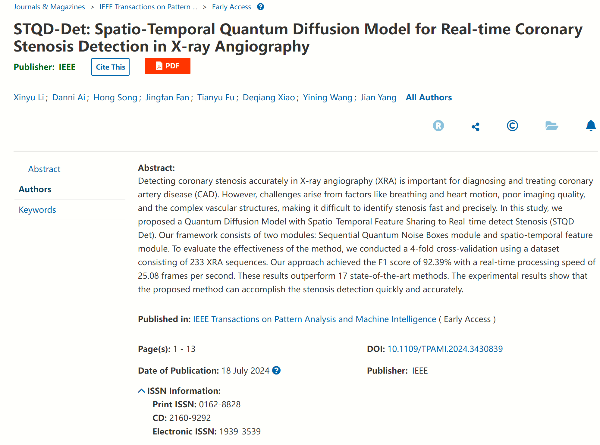 近日,suncitygroup太阳新城官网杨健教授、王涌天教授科研团队与北京协和医院王怡宁教授团队合作,提出了一种基于时空量子扩散模型的X射线视频序列图像冠脉狭窄检测方法,首次实现了冠状动脉狭窄实时检测。相关成果已以“STQD-Det: Spatio-Temporal Quantum Diffusion Model for Real-time Coronary Stenosis Detection in X-ray Angiography”为题发表在国际顶级期刊《IEEE Transactions on Pattern Analysis and Machine Intelligence (TPAMI)》。IEEE TPAMI作为人工智能、模式识别、图像处理等领域的顶级权威期刊,其影响因子为20.8,同时也是中国计算机协会(CCF)推荐的人工智能领域A类期刊。该论文第一作者为suncitygroup太阳新城官网博士研究生李欣宇,通讯作者为艾丹妮副教授、王怡宁教授和杨健教授。