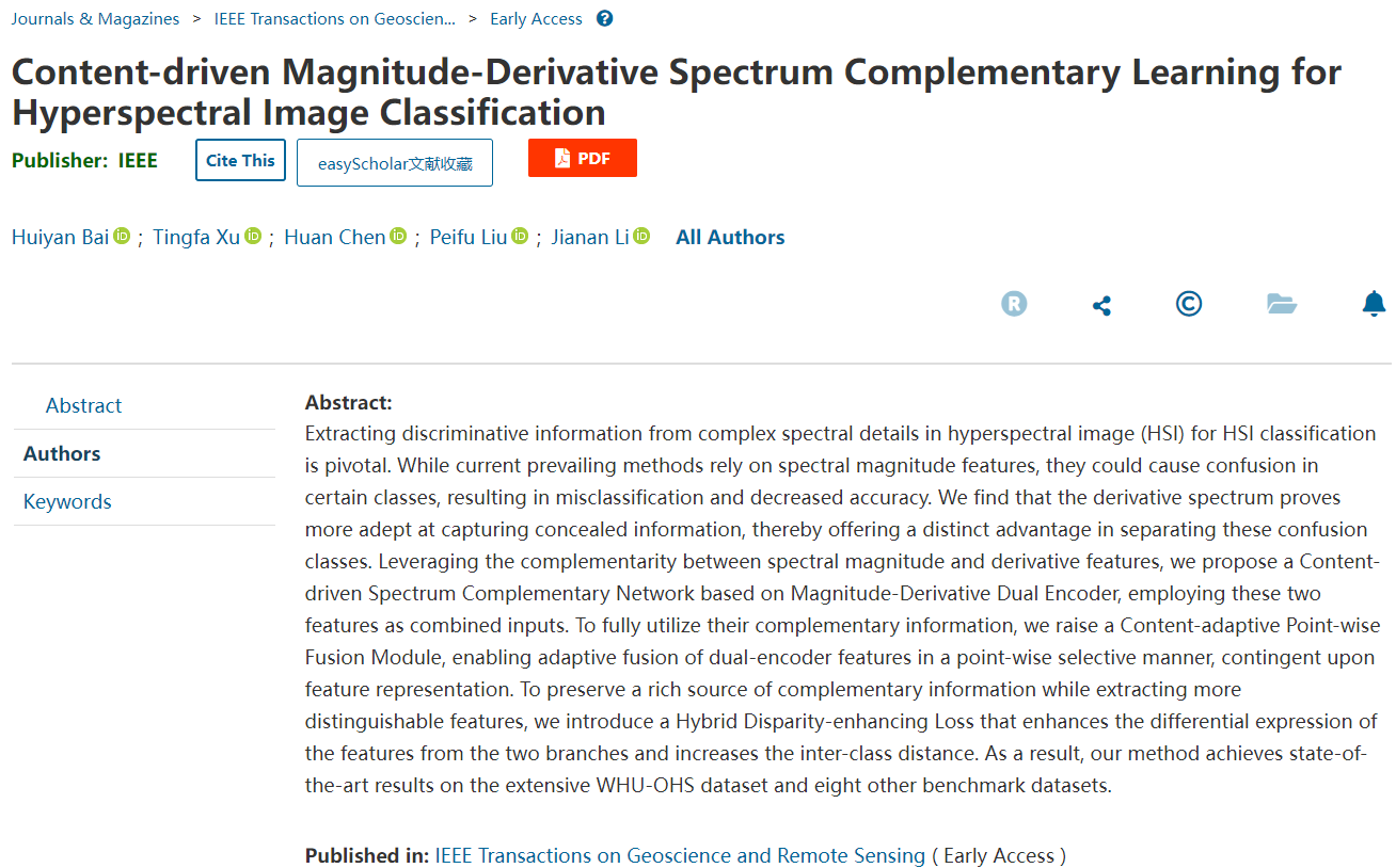 近日,suncitygroup太阳新城官网许廷发教授科研团队在高光谱遥感图像处理领域取得新进展,研究成果以“Content-driven Magnitude-Derivative Spectrum Complementary Learning for Hyperspectral Image Classification”为题发表在遥感领域的国际顶级期刊《IEEE Transactions on Geoscience and Remote Sensing》(IEEE TGRS)上。该工作第一作者为suncitygroup太阳新城官网硕士研究生白荟琰,通讯作者为suncitygroup太阳新城官网许廷发教授和李佳男特别副研究员。