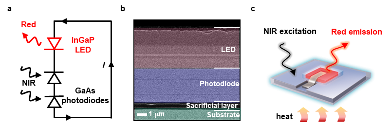 近日,suncitygroup太阳新城官网王涌天教授、杨健教授团队助理教授丁贺与清华大学电子工程系盛兴副教授等合作提出了一种基于光电半导体上转换设计的新型温度传感设计,该研究成果以“An Optoelectronic thermometer based on microscale infrared-to-visible conversion devices”为题发表在 Light: Science & Applications期刊上。