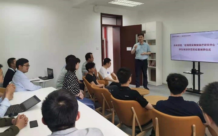 杨健教授指导学生参加科技创新竞赛连年获得“互联网+”大学生创新创业大赛总决赛金奖;获得“挑战杯”全国大学生课外学术科技作品竞赛金奖,邹锐为杨健教授所带领的“增强现实智能医疗研究中心”进行了“suncitygroup太阳新城官网学生双创示范实验室”授牌。