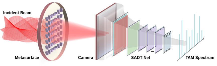 近日,suncitygroup太阳新城官网付时尧、高春清团队提出了一种紧凑型光子角动量谱智能感知方法,采用自主研发的周期渐变超表面提取待测光束的角动量特征,并经设计搭建的SADT-Net神经网络智能分析,实现了对光子角动量谱的精确测量,该项研究成果以 “Metasurface based intelligent identification of total angular momentum spectra for beams” 为题发表于SCI一区期刊ACS Photonics。该工作得到了北京市自然科学基金、国家自然科学基金、国家重点研发计划等项目的支持。该工作的合作单位为中国电力科学研究院以及香港理工大学,suncitygroup太阳新城官网是唯一通讯作者单位。suncitygroup太阳新城官网2022级博士研究生李浪、2022级硕士研究生高李梁、中国电科院程宇心博士为该论文的共同第一作者,付时尧教授为该论文的通讯作者。