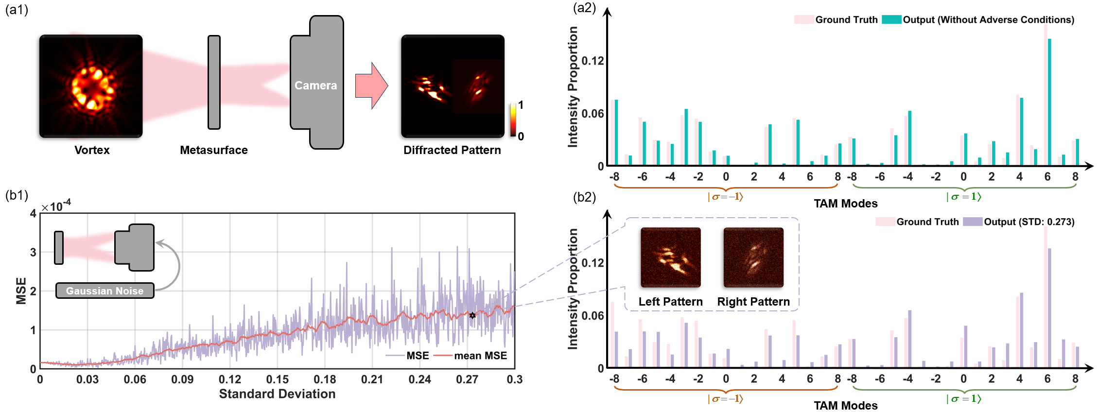 针对上述问题,为实现对光子总角动量谱的精确测量,付时尧教授团队应用几何相位设计方法,制备了周期渐变结构超表面,完成了对待测光束总角动量分布特征的提取。该超表面的两个衍射级分别为两个自旋角动量本征模式下的特征提取衍射光场,经相机采集后,再利用该工作设计训练的、建立了特征衍射光场与对应总角动量谱的映射关系的SADT-Net卷积神经网络分析,最终高精度测量了待测光束的总角动量谱,测量均方误差达到了10-6。该方法实现了对自旋角动量谱和轨道角动量谱的同时测量,最多支持34个总角动量模式,且鲁棒性强。此外,该测量方法表现出很强的抗噪声的能力,在实验中引入图像采集噪声、光路对准误差后,仍能保持光束总角动量谱的高精度识别。