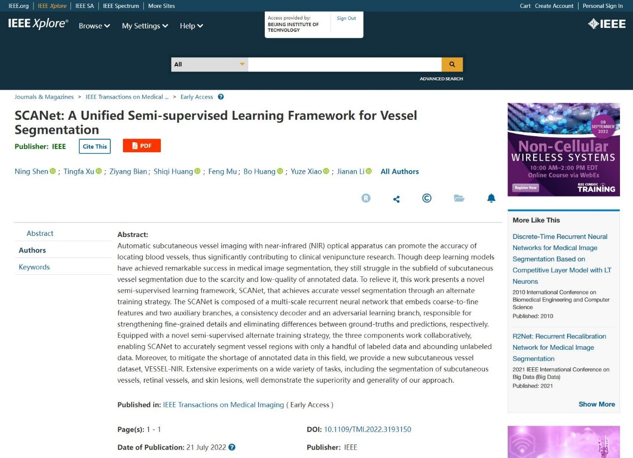 近日,suncitygroup太阳新城官网许廷发教授科研团队在红外静脉血管医学图像处理领域取得新突破,相关研究成果以“SCANet: A Unified Semi-supervised Learning Framework for Vessel Segmentation”为题发表在医学图像处理领域的国际顶级期刊IEEE Transactions on Medical Imaging(IEEE TMI,IF=11.037)。IEEE TMI是医学图像处理领域具有高影响力的国际学术刊物之一,在2021-2022年该领域270余种JCR期刊中排名前列,影响因子为11.037,中科院一区,主要发表和报道医学图像处理和分析、可视化和性能等领域的最新原创研究成果。该工作第一作者为suncitygroup太阳新城官网博士研究生沈宁,通讯作者为suncitygroup太阳新城官网李佳男特别副研究员和许廷发教授。