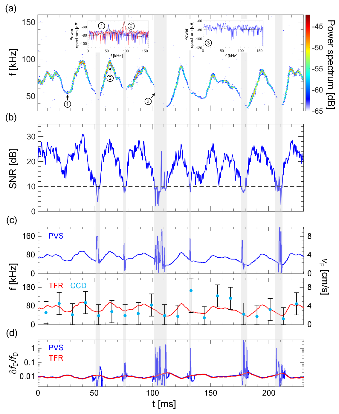 当多个光镊粒子在空芯光纤中同时导引时,由于粒子的运动速度相近,其多普勒频谱相互交叠(图4a),传统PVS法难以准确识别每个粒子的速度,导致测速结果在不同多普勒峰值之间跳跃,出现寻峰混叠现象(图4b)。而TFR法由于采用了多峰识别算法,可以很好地解决寻峰混叠问题,高保真地分辨出粒子速度(图4c)。此外,由于不同粒子的多普勒频谱SNR不同,传统PVS法只能识别出最强峰值,导致弱散射粒子的速度信息丢失;而TFR法由于融合了高SNR区间的粒子速度特征,即使不同粒子多普勒频谱的瞬时SNR差异很大,也能实现正确分辨。