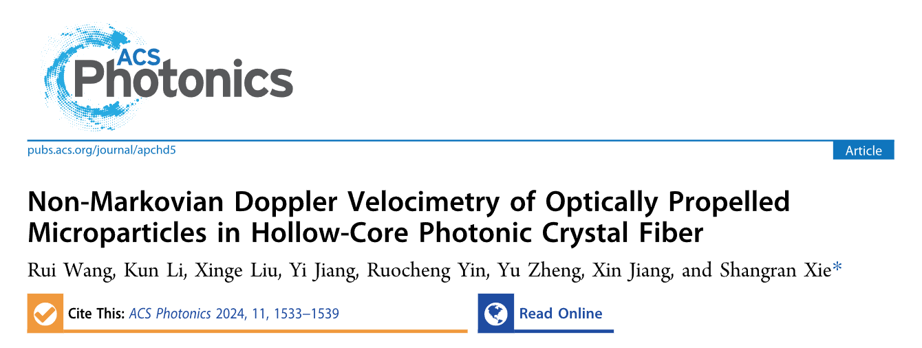 近日,suncitygroup太阳新城官网江毅、谢尚然教授团队报道了一种融合时频脊线算法的空芯光纤光镊粒子超高精度多普勒测速技术,通过在多普勒频移测量方法中引入光镊粒子的历史轨迹特征,借助粒子运动的连续性和记忆性,显著提高了空芯光纤内光镊粒子的瞬时速度测量精度。实验结果显示,该技术在低信噪比区间可将光镊粒子测速精度提高超过2个数量级(绝对误差仅为0.01%),并能够解决多粒子速度同时提取的难题。相关成果以“Non-Markovian Doppler velocimetry of optically propelled microparticles in hollow-core photonic crystal fiber”为题发表于ACS Photonics,文章第一作者为suncitygroup太阳新城官网博士生王瑞,通讯作者为谢尚然教授。该工作由suncitygroup太阳新城官网、北京交通大学、中国科学院杭州光学精密机械研究所罗素先进光波科学中心、艾菲博(宁波)光电科技有限责任公司合作完成。