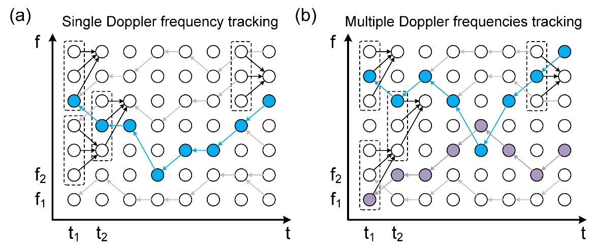 图2:(a) 时频脊线法寻找单个和 (b) 多个多普勒频移值的原理示意图。