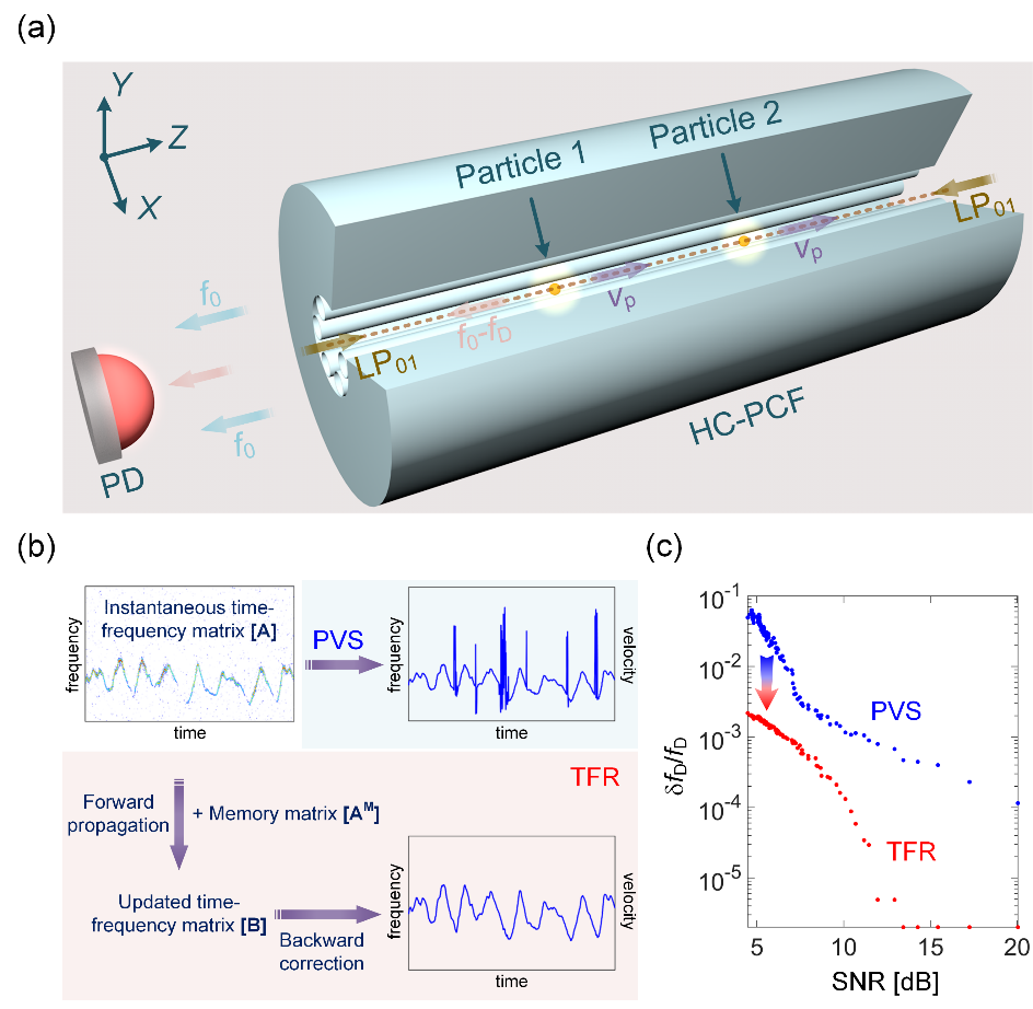 图1:空芯光纤内光镊粒子多普勒测速技术原理及其精度提升。