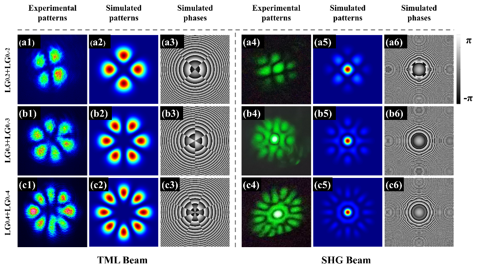 图2. 由LG 模式组成的横模锁定基频光和相应的倍频光实验结果