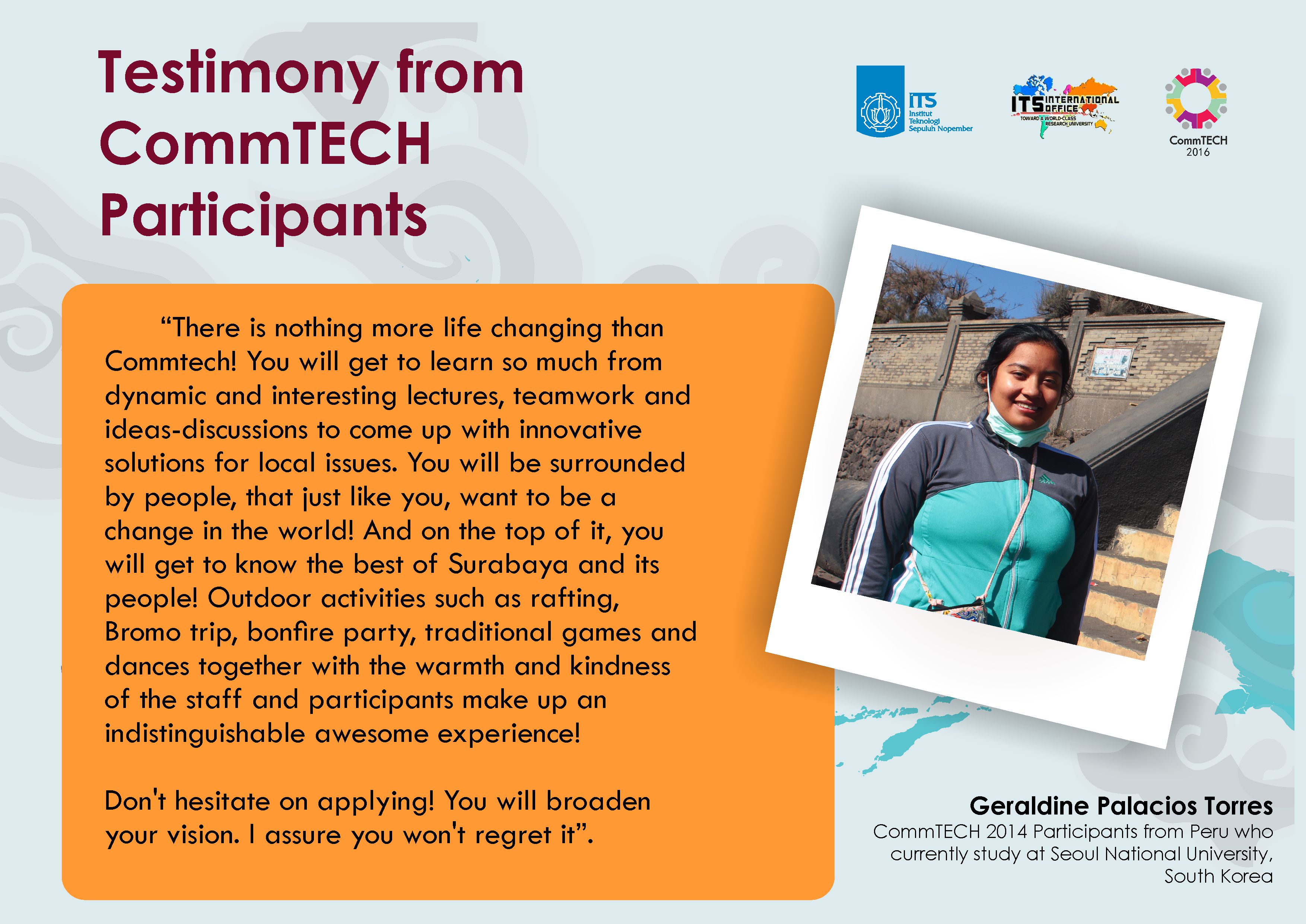 In this email, we are proudly launching our video Teaser of CommTECH Camp Highlight 2016. This Video Teaser was made by one of our Volunteer Students in ITS International Office.This program open for active students, non-academic staff & lecturers/professor. The fees of this program is USD 1600. The fees will cover everything such as accommodations, scheduled meals, tuition fee, workshop materials, airport pick up & drop off services, trip to bromo mountain, rafting except roundtrip airfare & travel insurance. We would like kindly to request your assistance to disseminate this information to your students/staffs/lecturers. You will get automatically 1 full scholarship, 1 50% scholarship (pay USD 800) & 1 partial scholarship (pay USD 1000) if you send at least 3 students/staffs/lecturers in this program. In this case, you can nominate the students/staffs/lecturers yourself to get the scholarship or you can split the scholarship so that each students/staffs/lecturers will pay only USD 600 each (for at least 3 participants). Please be aware that you can send up to 7 students/staffs/lecturers with detail 1 full scholarship, 1 50% scholarship, 1 partial scholarship & 4 full payment. The deadline of this program is July 1, 2016.