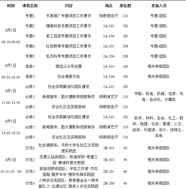 社会实践立项申报审核工作已经完成,请同学们下载附件里的《团队信息汇总表》,查看本团队编号、培训课程等信息(学生身份证号、电话均已隐去)。由于有些团队申报内容不规范(如:实践形式、专题均只可选一项,但表格里填写多项),审核过程中已经修改,一切以汇总表内信息为准。各团队根据《团队信息汇总表》里培训课程统计,按时参加校团委将于6月5日(周日)开展的培训课程。具体要求如下: