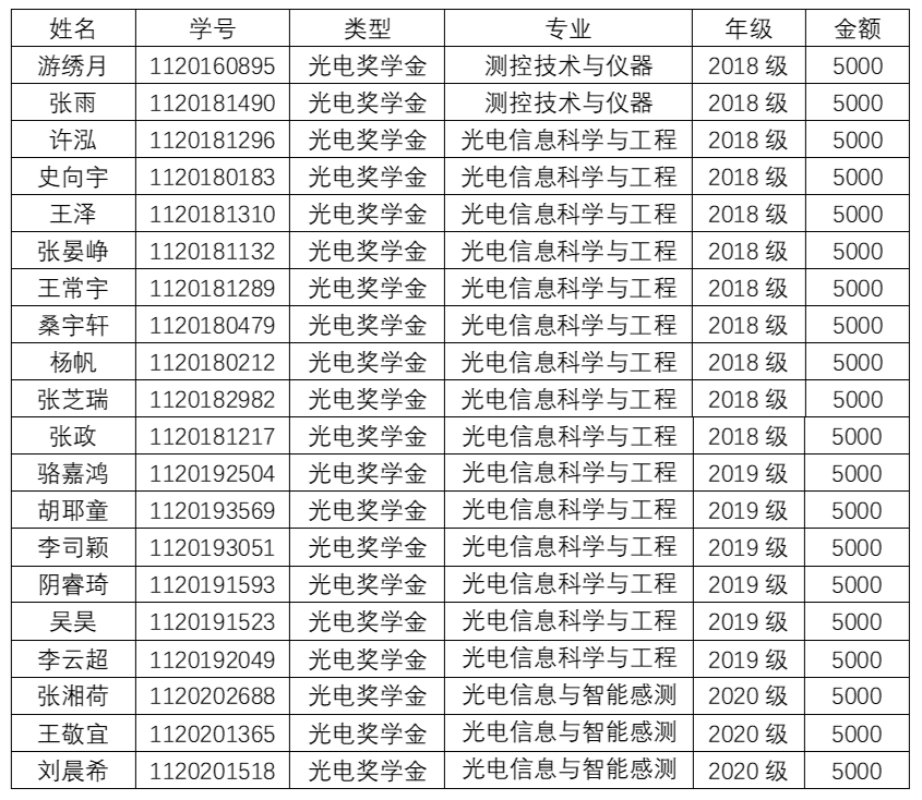 2020-2021学年“光电奖助学金”评选结果