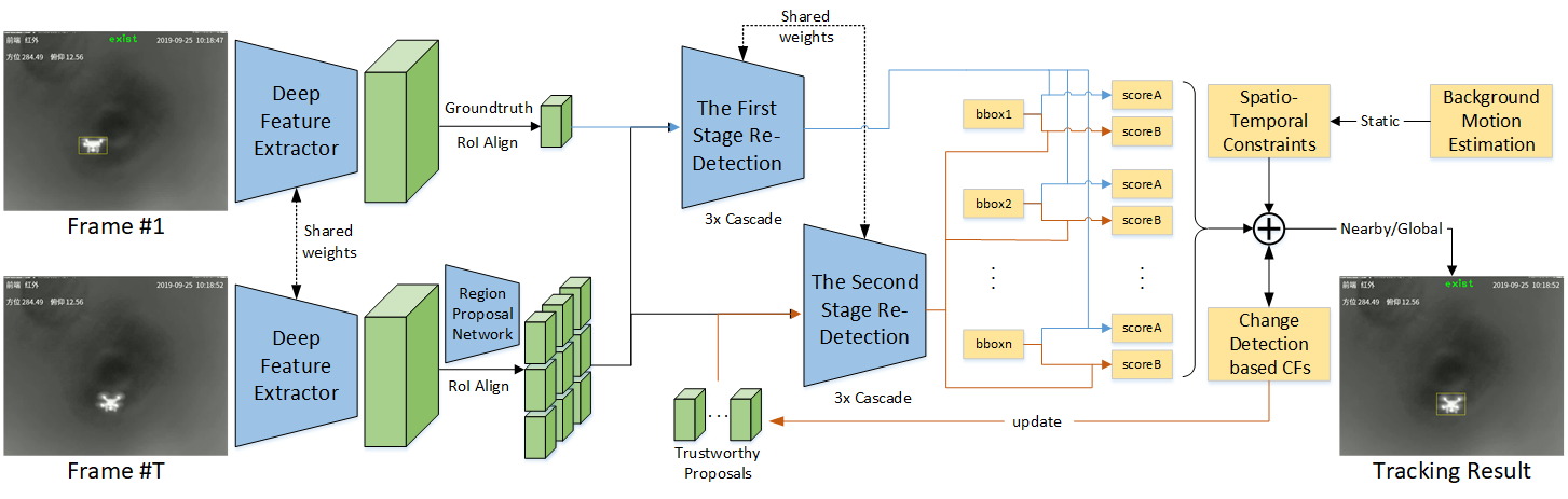 冠军团队针对红外无人机目标尺度小、对比度低、易受背景干扰等难题,提出的新型SiamSTA跟踪器。SiamSTA充分挖掘红外视频序列中的时空信息和目标运动特征,设计了局部跟踪和全局检测的自适应动态目标搜索机制:当目标状态可靠时采用局部跟踪,利用视频时空连续性,有效抑制背景干扰;当目标状态不可靠时(发生完全遮挡、从视野消失等)采用全局检测,结合目标运动特征锁定候选区域,提高目标再捕获概率。