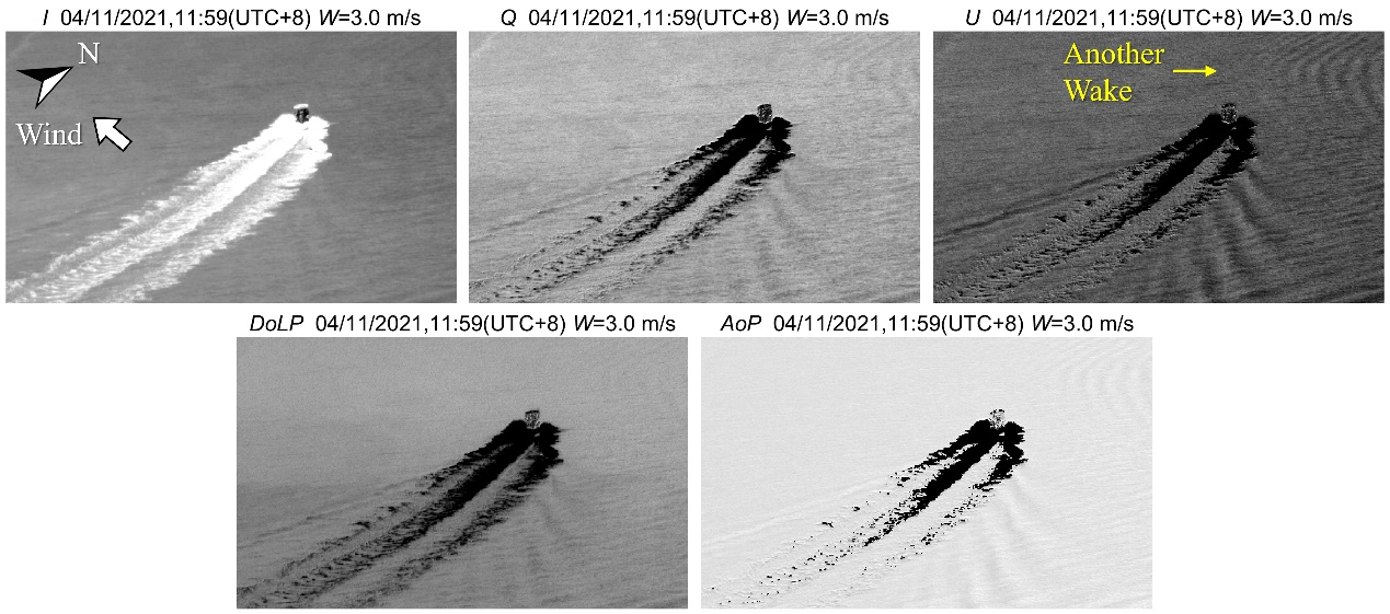 针对这一科学问题,suncitygroup太阳新城官网金伟其教授团队率先提出利用光学偏振成像技术进行水下运动目标水面尾迹的机载遥感观测,并通过理论建模、仿真和实验手段论证了技术可行性。研究结果表明,团队采用的线偏振Stokes 矢量图像具有比传统强度图像更好的尾迹目标对比度,成像质量对海况、光照等环境因素的影响具有较好的鲁棒性;且使用的DoFP偏振成像系统可很好地集成到无人机平台实现灵活便捷的航拍遥感探测;进一步地,研究团队利用获取到的偏振海面尾迹图像信息,实现了水下运动目标运动状态解译、海面三维面型复原等诸多应用。除了在海洋安全方面的重要意义,该项研究也为中小尺度海洋动力过程的观测提供了有效的技术参考。