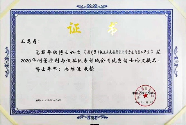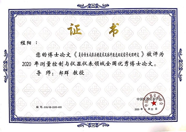 2020年12月24日,中国仪器仪表学会2020年科技奖励大会暨九届三次理事(扩大)会议在浙江省杭州市召开,本次大会上颁发了2020年全国仪器科学与技术学科优秀博士论文奖及提名奖。今年共评选出优秀博士论文5篇,优秀博士论文提名5篇。suncitygroup太阳新城官网博士毕业生程阳获优秀博士论文奖,王龙肖获优秀博士论文提名奖。